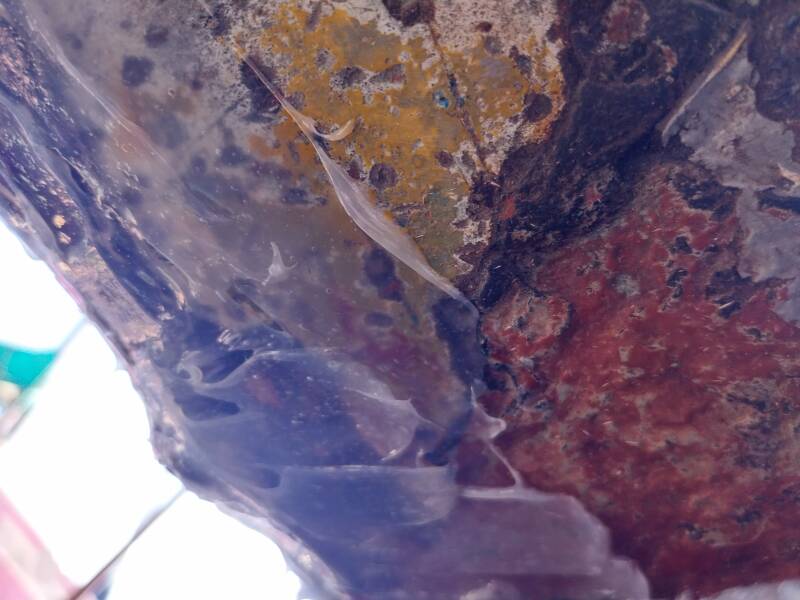 Questa mattina, andando a depositare il bucato in lavanderia, ho fatto la conoscenza di Marisa, l’amica di Andréa che custodisce la casa, durante la loro assenza. Sembra cordiale, ma anche molto timida, infatti dopo un rapido scambio di informazioni, si è congedata. Arrivati in cantiere, mentre io ho continuato i miei lavori in coperta, Mario ha ripreso ad occuparsi della chiglia. Ha rimosso una parte della vetroresina che si era bagnata di gasolio, cambiando colore e consistenza, ha carteggiato la superficie per ripulirla e preparato la filettatura a livello del buco. La prima volta che siamo intervenuti, non avevamo sufficiente spazio per effettuare l’operazione di filettatura e forse è proprio a causa di questo dettaglio che non abbiamo avuto successo. Prima di pranzo, è riuscito a tappare il buco con una vite ricoperta di teflon. Nel pomeriggio, abbiamo ricoperto tutto con della colla epossidica, in modo da rinforzare tutta la parte di chiglia, preparandola alla resinatura.