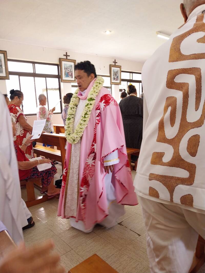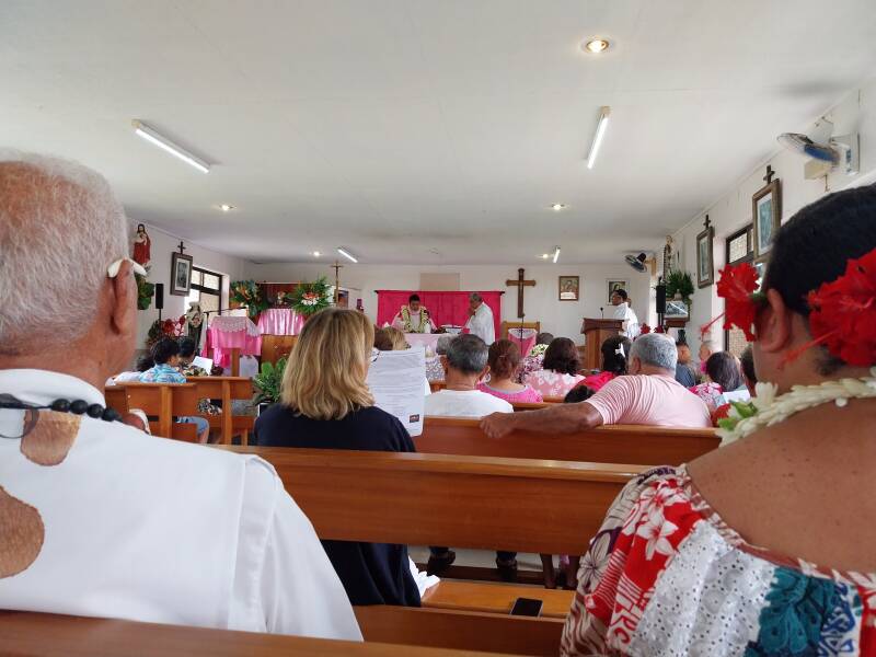 La funzione si è svolta nella gioia generale: canti, musica e persino balli hanno animato questo momento di preghiera domenicale. Purtroppo, c’era una giovane donna che, accompagnata e fisicamente sostenuta dai genitori, piangeva dando l’impressione di essere inconsolabile. Una coppia di anziani, invece, mi sono stati indicati da Joss come i genitori di un uomo di cinquant’anni che, meno di un mese fa, nel corso di un’immersione in apnea alle isole Tuamotu, non è più riemerso, perdendo così la vita e lasciando la moglie e tre figli in tenera età.