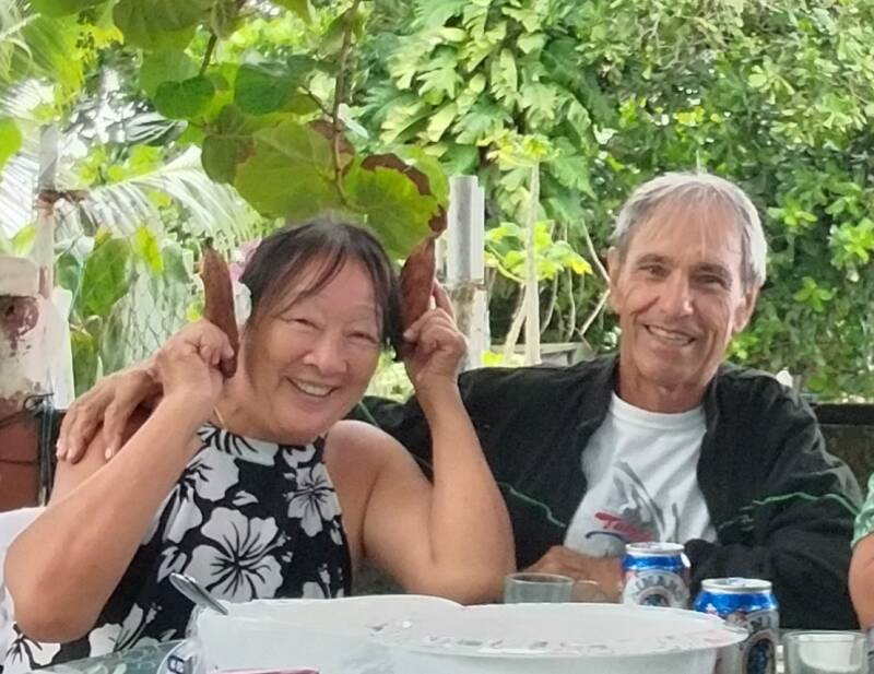 Ci siamo svegliati mentre Marisa usciva in macchina, sotto una pioggerelli a leggera leggera che, dopo una decina di minuti, ha lasciato spazio ad un bel sole. Arrivati di buon’ora al cantiere, abbiamo cominciato a pennellare l’estremità del bompresso con la vernice epossidica. Ce ne vorranno quattro o cinque mani per essere sicuri che, anche in quel punto, il legno resista alle intemperie. Abbiamo trovato ancora acqua in sentina, ma, visto che Mario aveva dimenticato di chiudere ermeticamente l’oblò del bagno, speriamo che sia stata quella la causa. Naturalmente, monitoreremo la situazione nei prossimi giorni. L’ultima operazione della mattinata è stato l’ennesimo riempimento del serbatoio di gasolio di poppa, sperando davvero che la chiglia non lasci fuoriuscire nulla. Rientrando a casa per pranzo, ho ricevuto un messaggio di Joss che, ci proponeva di partecipare ad un pranzo polinesiano domani dopo la messa. Ha accennato ad un repas partagé, le ho quindi chiesto di spiegarmi con esattezza cosa si intendesse con tale formula, vista la nostra scarsa conoscenza dei costumi locali, non tanto per mancanza di volontà quanto per scarsità di occasioni presentatesi in questi due mesi e mezzo di soggiorno a Tahiti.